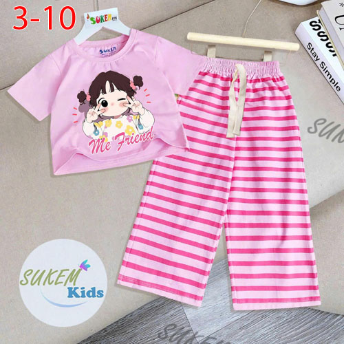 A487792 - Set bé gái thun coton 4c áo may ngắn tay dễ thương với hình chibi quần dài ống suông chạy