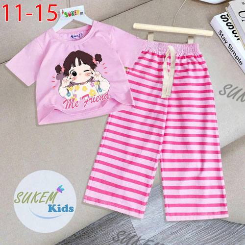 A487795 - Set bé gái thun coton 4c áo may ngắn tay dễ thương với hình chibi quần dài ống suông chạy