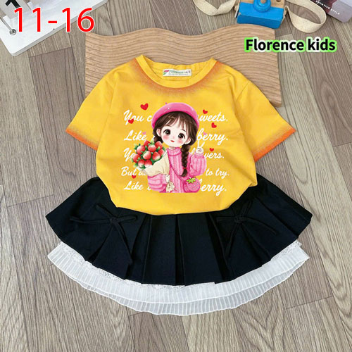 A487978 - Set váy xếp ly ren cực xinh cho bé áo thun cotton in cô bé chân váy xếp ly kaki_Size 11-16