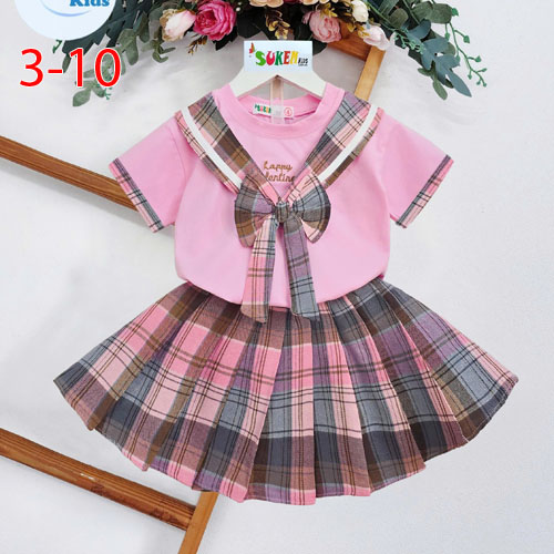 A488018 - Set váy bé gái áo thun ngắn tay cổ thủy thủ đính nơ karo thêu đắp chân váy may xếp ly vải