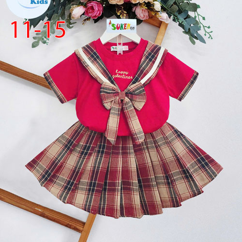 A488025 - Set váy bé gái áo thun ngắn tay cổ thủy thủ đính nơ karo thêu đắp chân váy may xếp ly vải
