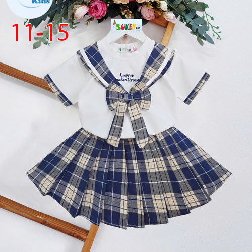A488028 - Set váy bé gái áo thun ngắn tay cổ thủy thủ đính nơ karo thêu đắp chân váy may xếp ly vải