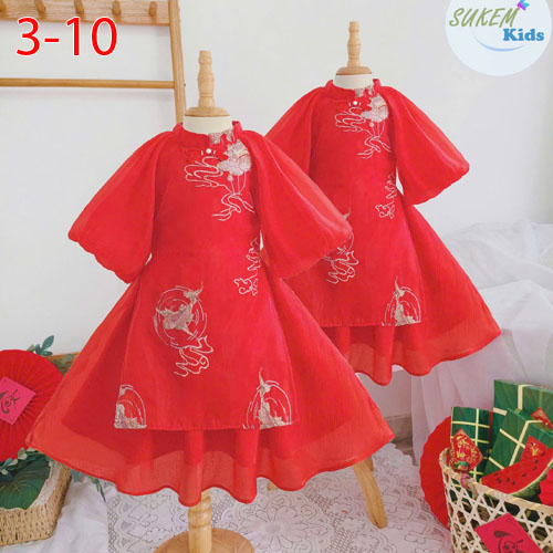 A488069 - Set áo dài cho bé áo dài tay phồng 2 lớp vải ren thêu tinh tế kết hợp váy xoè bồng bềnh_Si