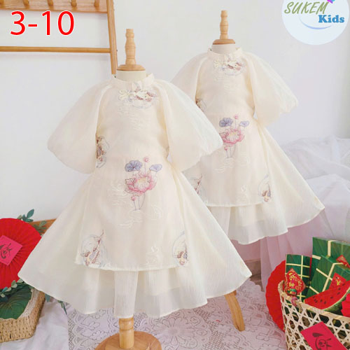 A488070 - Set áo dài cho bé áo dài tay phồng 2 lớp vải ren thêu tinh tế kết hợp váy xoè bồng bềnh_Si
