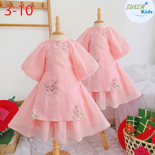 A488072 - Set áo dài cho bé áo dài tay phồng 2 lớp vải ren thêu tinh tế kết hợp váy xoè bồng bềnh_Si