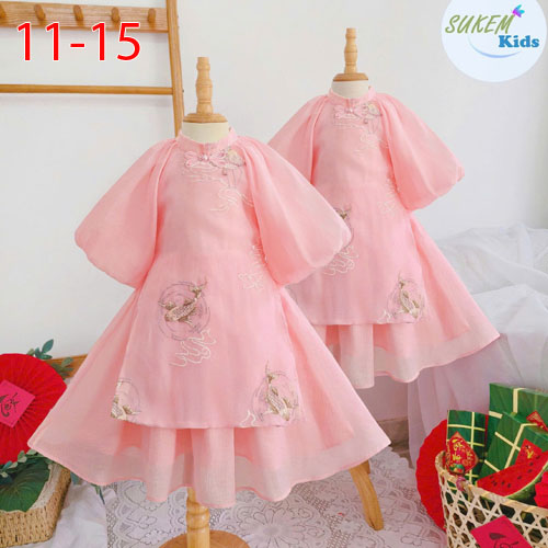 A488073 - Set áo dài cho bé áo dài tay phồng 2 lớp vải ren thêu tinh tế kết hợp váy xoè bồng bềnh_Si