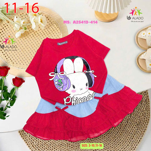 A488155 - Set váy jean phối ren 2 tầng in cô gái xinh chất thun cotton 4c_Size 11-16