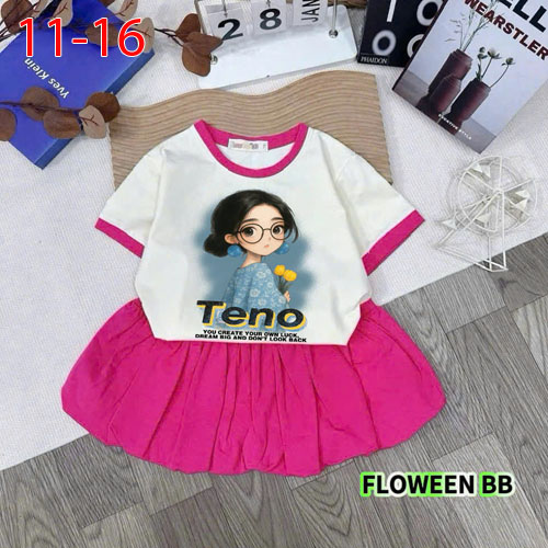 A488276 - Set bé gái chất thun cotton 4c in cô bé TENO chân váy bí kèm chip trong_Size 11-16