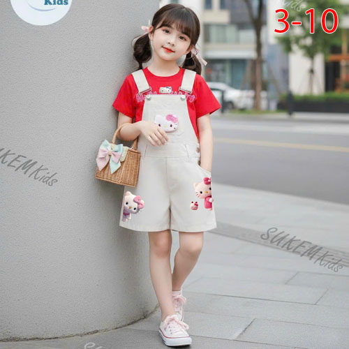 A488280 - Set bé gái áo may ngắn tay hình ép kitty yếm quần cài nút kèm phụ kiện cool đắp túi 2 bên