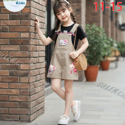A488285 - Set bé gái áo may ngắn tay hình ép kitty yếm quần cài nút kèm phụ kiện cool đắp túi 2 bên