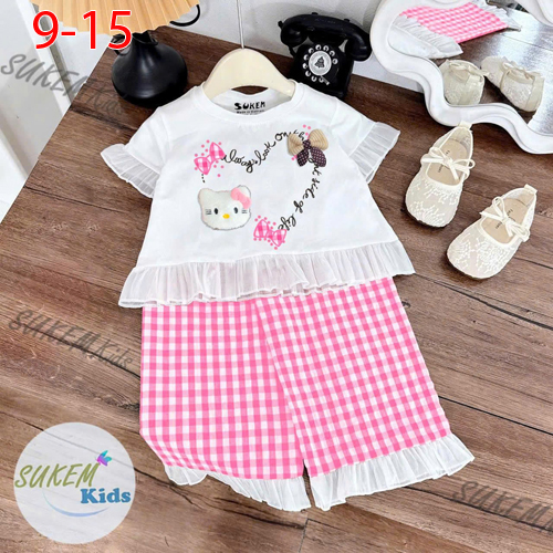A488956 - Set bé gái áo may ngắn tay nhún bèo xinh ép hình cute đính phụ kiện Kitty quần dài suông k