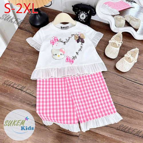 A488961 - Set bé gái áo may ngắn tay nhún bèo xinh ép hình cute đính phụ kiện Kitty quần dài suông k