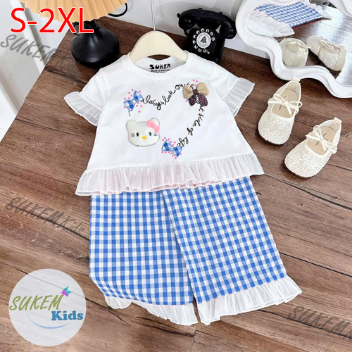A488965 - Set bé gái áo may ngắn tay nhún bèo xinh ép hình cute đính phụ kiện Kitty quần dài suông k