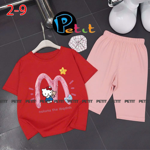 A489074 - Bộ bé gái thun cotton 4c áo tay ngắn mix cùng quần ôm ngố in Kitty Cún_Size 2-9
