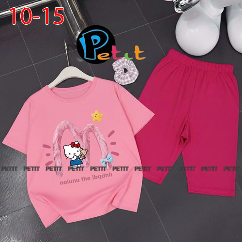 A489123 - Bộ bé gái thun cotton 4c áo tay ngắn mix cùng quần ôm ngố in Kitty Cún_Size 10-15
