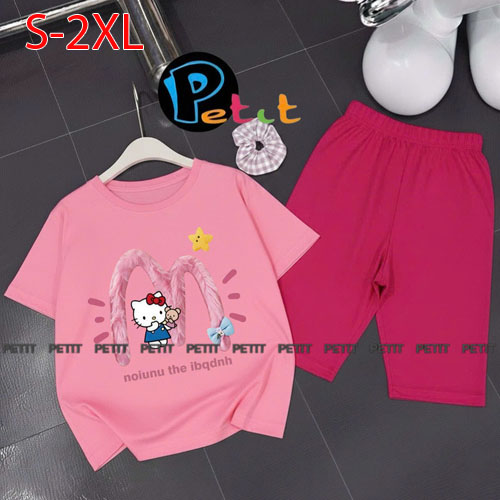 A489164 - Bộ bé gái thun cotton 4c áo tay ngắn mix cùng quần ôm ngố in Kitty Cún_Size S-2XL
