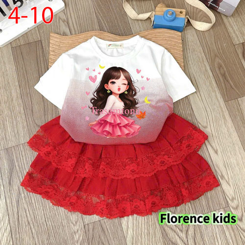 A489298 - Set váy xếp ly ren cực xinh cho bé áo thun cotton in cô bé chân váy ren 2 tầng_Size 4-10