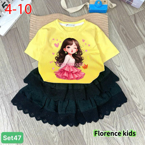 A489299 - Set váy xếp ly ren cực xinh cho bé áo thun cotton in cô bé chân váy ren 2 tầng_Size 4-10