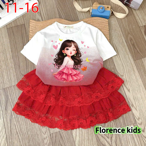 A489307 - Set váy xếp ly ren cực xinh cho bé áo thun cotton in cô bé chân váy ren 2 tầng_Size 11-16