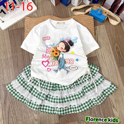 A489490 - Set bé gái áo thun cotton in cô bé chân váy caro phối ren 2 tầng_Size 11-16