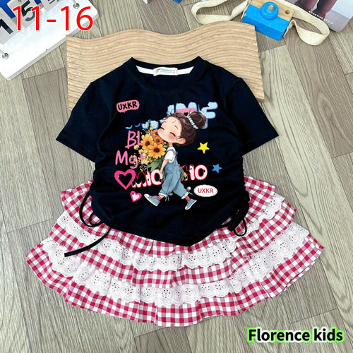 A489493 - Set bé gái áo thun cotton in cô bé chân váy caro phối ren 2 tầng_Size 11-16
