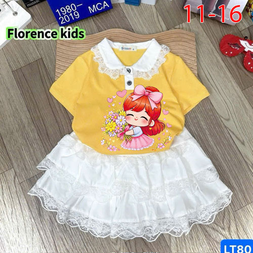 A489649 - Set bé gái áo chất thun cotton 4c cô bé cầm bó hoa chân váy ren 3 tầng kèm chip trong_Size
