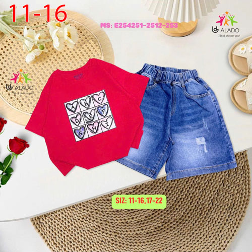 A489870 - Set quần ngố wash thời trang áo in bé gái trái tim quần jean_Size 11-16