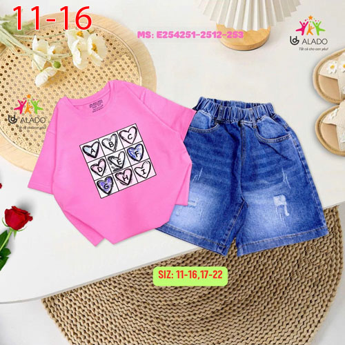 A489872 - Set quần ngố wash thời trang áo in bé gái trái tim quần jean_Size 11-16