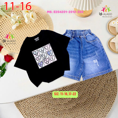 A489873 - Set quần ngố wash thời trang áo in bé gái trái tim quần jean_Size 11-16