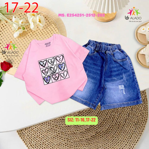 A489878 - Set quần ngố wash thời trang áo in bé gái trái tim quần jean_Size 17-22