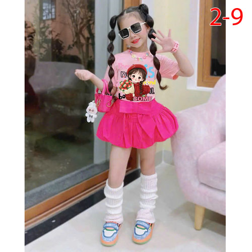 A490220 - Set bé gái áo thun cotton 4c in cô bé chân váy kaki bí kèm chip trong_Size 2-9