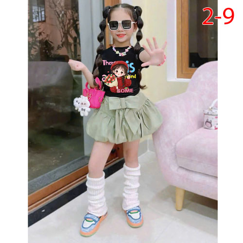 A490221 - Set bé gái áo thun cotton 4c in cô bé chân váy kaki bí kèm chip trong_Size 2-9