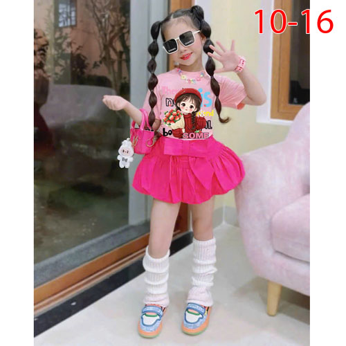 A490225 - Set bé gái áo thun cotton 4c in cô bé chân váy kaki bí kèm chip trong_Size 10-16