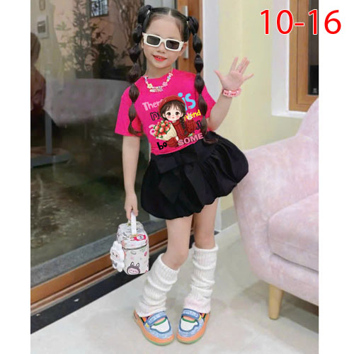 A490227 - Set bé gái áo thun cotton 4c in cô bé chân váy kaki bí kèm chip trong_Size 10-16