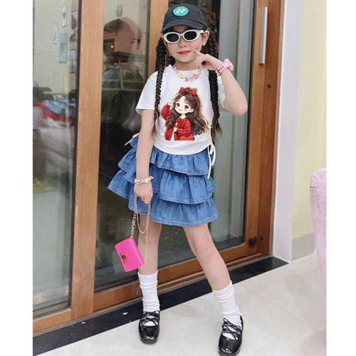 A490865 - Set bé gáiáo chất cotton 4c mềm mịn in cô bé chân váy jean 3 tầng_Size 5-12