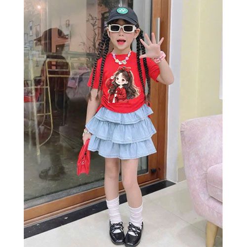 A490866 - Set bé gáiáo chất cotton 4c mềm mịn in cô bé chân váy jean 3 tầng_Size 5-12