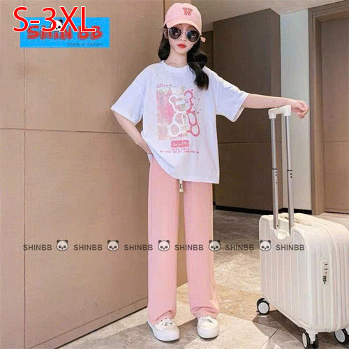 A491567 - Bộ thun thích hợp cho cả trai và gái áo tay ngắn phối cùng quần dài suông hoạ tiết tổng hợ