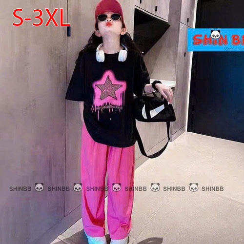 A491586 - Bộ thun thích hợp cho cả trai và gái áo tay ngắn phối cùng quần dài suông hoạ tiết tổng hợ