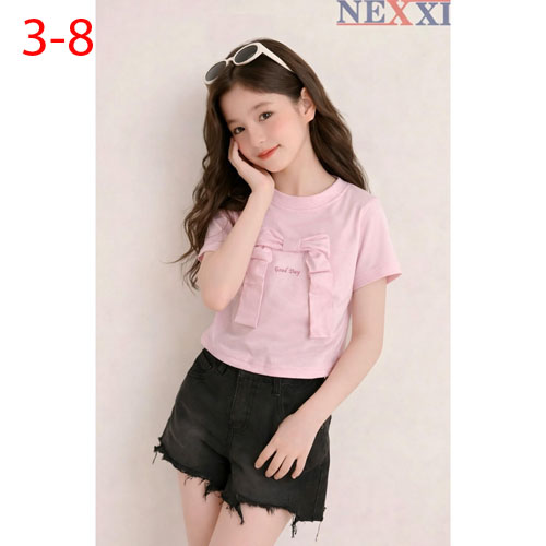 A496352 - Nexxi áo thun kiểu babytee siêu xinh vải cotton 4C nhún 2 bên đính nơ 3D in chữ_Size 3-8