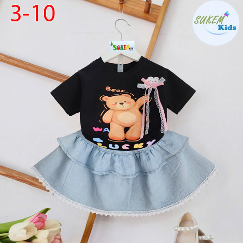A483649 - Set váy jean cho bé gái áo ngắn tay siêu cute gấu đính nơ chân váy jean may 2 tầng ren_Siz
