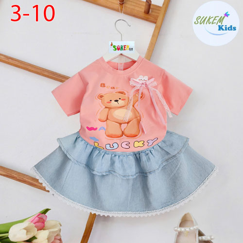 A483650 - Set váy jean cho bé gái áo ngắn tay siêu cute gấu đính nơ chân váy jean may 2 tầng ren_Siz