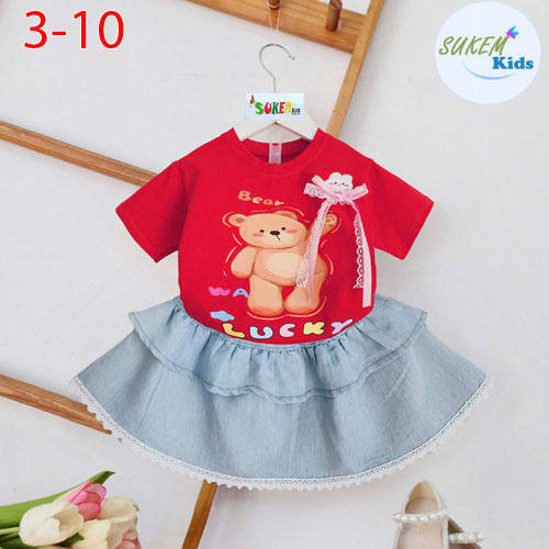 A483653 - Set váy jean cho bé gái áo ngắn tay siêu cute gấu đính nơ chân váy jean may 2 tầng ren_Siz