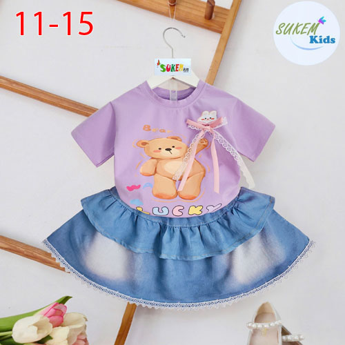 A483658 - Set váy jean cho bé gái áo ngắn tay siêu cute gấu đính nơ chân váy jean may 2 tầng ren_Siz