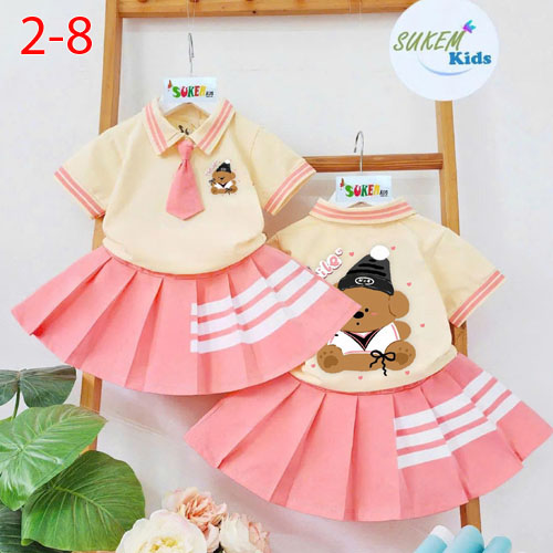 A486104 - Set váy áo thun ngắn tay cổ trụ thắt caravat in gấu cute chân váy may xếp ly in chạy sọc t