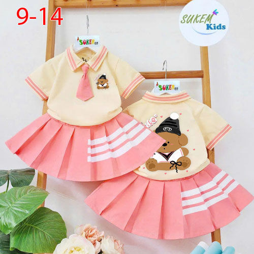 A486107 - Set váy áo thun ngắn tay cổ trụ thắt caravat in gấu cute chân váy may xếp ly in chạy sọc t