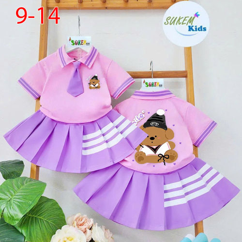 A486108 - Set váy áo thun ngắn tay cổ trụ thắt caravat in gấu cute chân váy may xếp ly in chạy sọc t