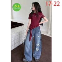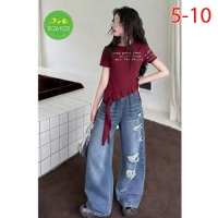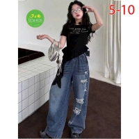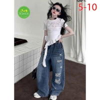 A467675 - (10/11)Set jean bé gái áo thun contton cách tân mix cùng quần jean suông wash rách cá tính