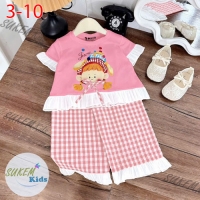A462445 - Set bé gái áo may ngắn tay nhún bèo xinh ép hình cute đính nơ karo quần dài suông karo nhú