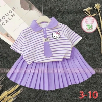 A467662 - Set áo trụ cà vạt váy xếp ly kèm chip đùi áo thun cotton in Kitty váy lụa nhập_Size 3-10