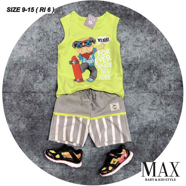 A159317 - Bộ Max áo cotton 4c, quần cotton sọc phối, in chó lướt ván Size 9-15